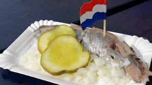 Dutch herring, or “haring,” is a popular street food. It is typically served raw with onions and pickles, and eaten by holding it by its tail and dipping it in the sauce.