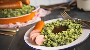 A traditional Dutch dish made of mashed potatoes mixed with vegetables such as kale or sauerkraut, served with sausage or meatballs.